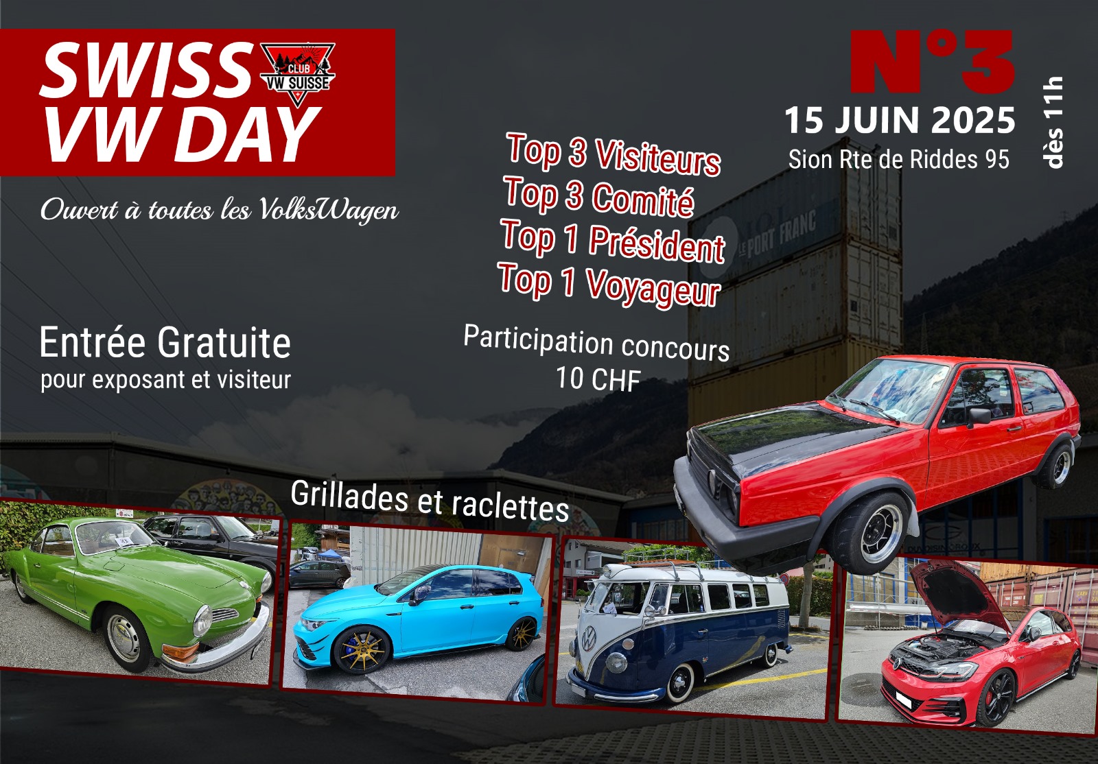 SWISS VW DAY N°3 par PiiWii_Master_26 | Oct 3, 2024 Les Inscriptions ont fermées SWISS VW DAY N°3 par Club Vw Suisse 293 293 people viewed this event. Date et heure 15-06-2025 @ 11:00 à 15-06-2025 @ 19:00 Lieu Rte de Riddes 95, 1950 Sion Partager avec des amis Facebook Twitter Linkedin Xing Pinterest
