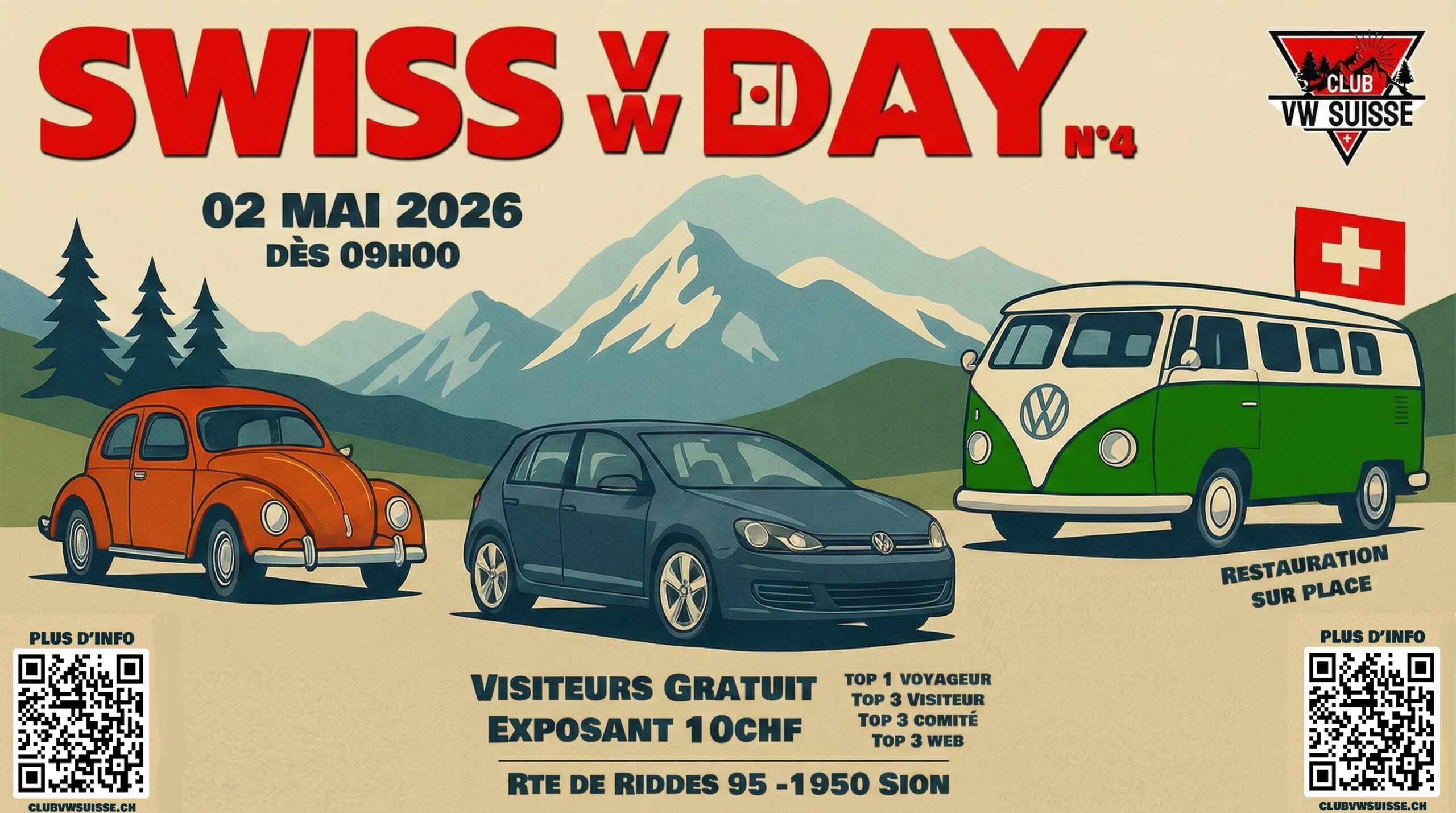 SWISS VW DAY N°4 par PiiWii_Master_26 | Mar 27, 2026 SWISS VW DAY N°4 par Club Vw Suisse 293 293 people viewed this event. S’inscrire à l’évènement Pour vous inscrire à cet évènement, envoyez vos informations par e-mail à piiwii32@gmail.com . Inscrivez-vous via le webmail : Gmail / AOL / Yahoo / Outlook Date et heure 02-05-2026 @ 09:00 à 02-05-2026 @ 20:00 Lieu Rte de Riddes 95, 1950 Sion Partager avec des amis Facebook Twitter Linkedin Xing Pinterest